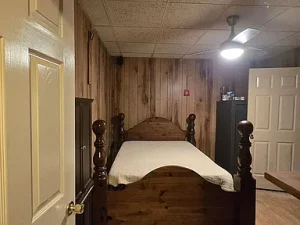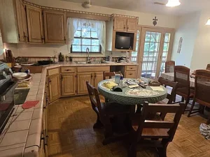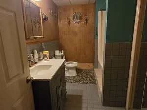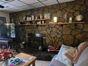 The home features four bedrooms and two bathrooms, including a handicap-accessible shower for added convenience. Inside, you’ll find a generous 16×30 living room with a striking rock wall and a wood or coal-burning fireplace insert, creating a warm and inviting space to relax. A spiral staircase leads to the spacious eat-in kitchen with oak cabinets, wood floors, a built-in oven, countertop burners, and a refrigerator included. The large laundry room offers plenty of storage, making daily living comfortable and organized.