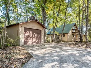 Tucked away on nearly an acre of peaceful woods, this charming 2-bedroom, 2.5-bath cabin offers the perfect mix of mountain serenity and rustic comfort. A concrete driveway leads to a detached one-car garage with extra parking nearby. Step inside to a warm, inviting living room with wood floors, vaulted ceilings with exposed log beams, and a gas-log stove for cozy evenings.