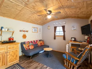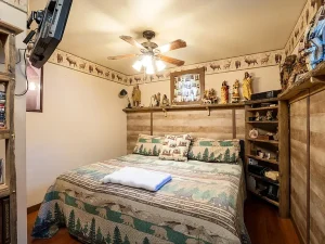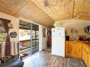 Outside, the property includes a barn and an outbuilding with its own kitchenette, currently used as a short-term rental. The flat, usable land is ideal for farm animals, gardening, or outdoor recreation, with mature landscaping and a creek meandering through the property. Offering privacy, charm, and natural beauty, this unique cabin perfectly blends country living with timeless character.