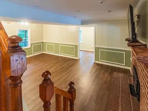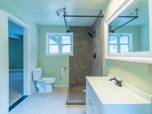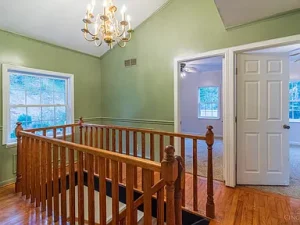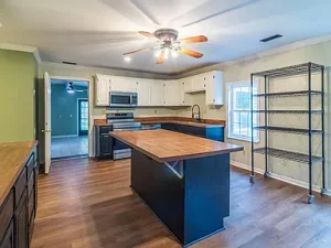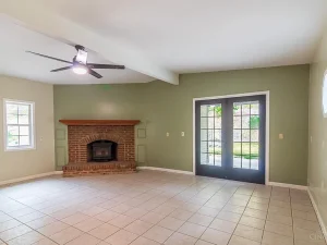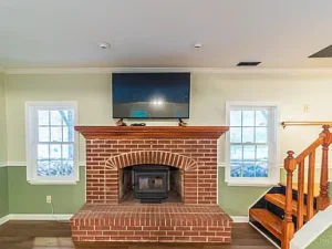 Inside, you’ll find a spacious living room featuring a charming brick wood-burning fireplace, ideal for cozy evenings. The open dining area flows into a gourmet kitchen equipped with stainless steel appliances, abundant cabinetry, a work island, and recessed lighting, creating a space that’s both functional and inviting.