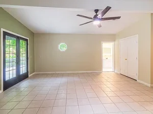 The step-down primary suite is a true retreat—featuring a private fireplace, an adjoining bath, and French doors that open directly onto the back patio, offering tranquil views of the surrounding nature.