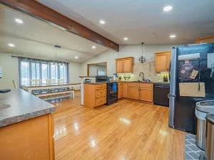 The home features 1,736 square feet on the main level with an unfinished walkout basement, providing room to expand. Inside, you’ll find a spacious living room with a cozy wood stove, updated electrical, and new lighting throughout. The large covered back patio offers beautiful views of the land and a huge pond, creating a perfect spot for relaxing or entertaining.