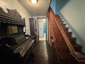 The main floor includes a bedroom, full bath, kitchen, dining room, and laundry area, allowing for single-level living convenience. Upstairs, you’ll find two spacious bedrooms, a sitting room (which can serve as an optional bedroom), a utility room, and another full bath. The home’s high ceilings and detailed woodwork highlight its historic craftsmanship.