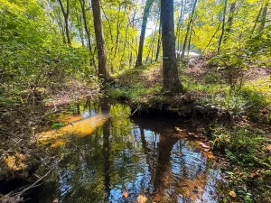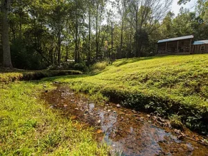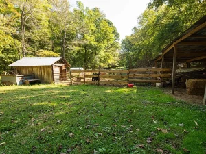 Outside, the land offers both functionality and natural beauty. A livestock corral and small pasture area make the property ideal for hobby farming, animals, or self-sufficient living. A natural spring provides water to the property, and a year-round stream runs along the front boundary, enhancing both the aesthetics and utility of the land.