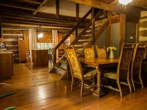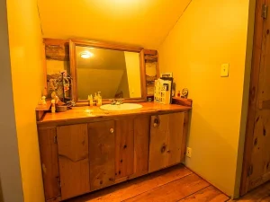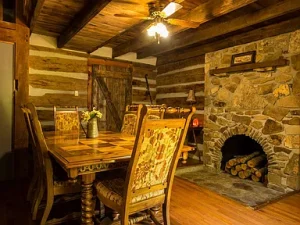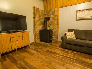 While the cabin is equipped with central heat, a wood-burning stove in the living room adds rustic charm and provides an efficient heat source during colder months.