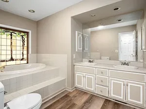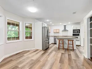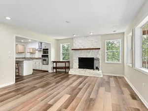 Inside, wood floors and vaulted ceilings create warmth and openness throughout. The kitchen features granite countertops, stainless steel appliances, and a central island, while the Great Room showcases a whitewashed stone wood-burning fireplace surrounded by large windows. The main-level primary suite includes a double vanity bath, garden tub, and walk-in closet.