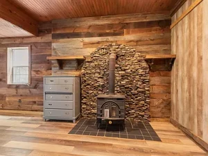 Upstairs are two spacious bedrooms, a full bath, and a bright landing overlooking the backyard. The finished lower level adds a rustic touch with a stone-accented wet bar, wood-burning stove, and recreation space—plus a one-car garage and full bath.