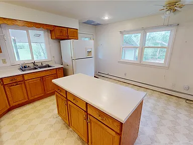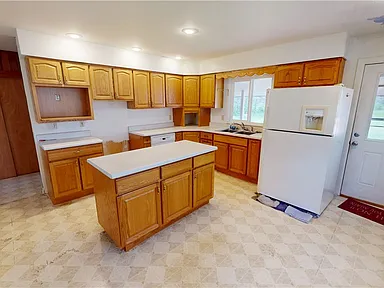 The kitchen is both functional and welcoming, featuring generous cabinet space and an island that makes everyday living and hosting feel easy.