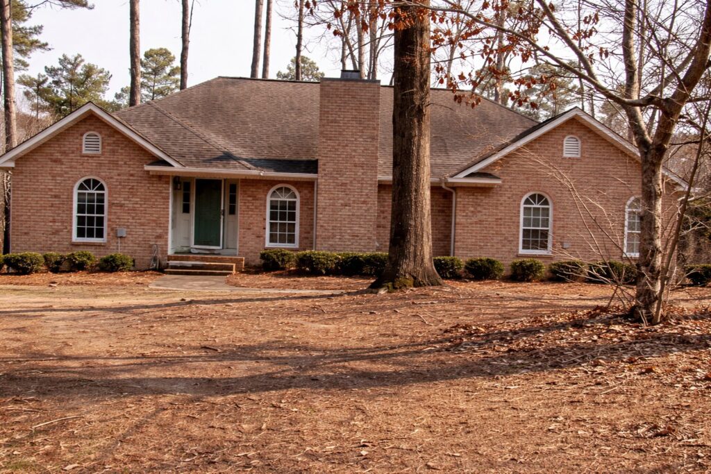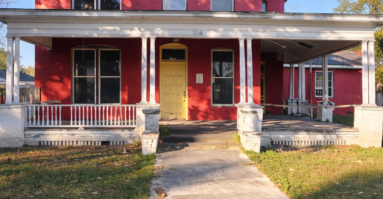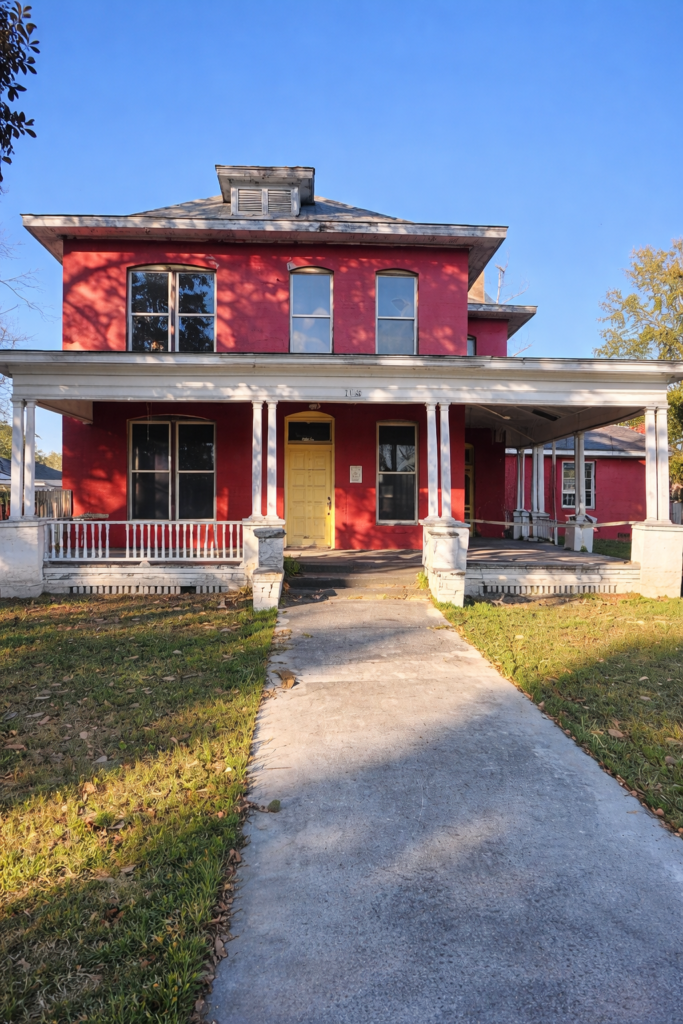Charming Two-Story Red Home with Classic Front Porch in a Peaceful Residential Setting