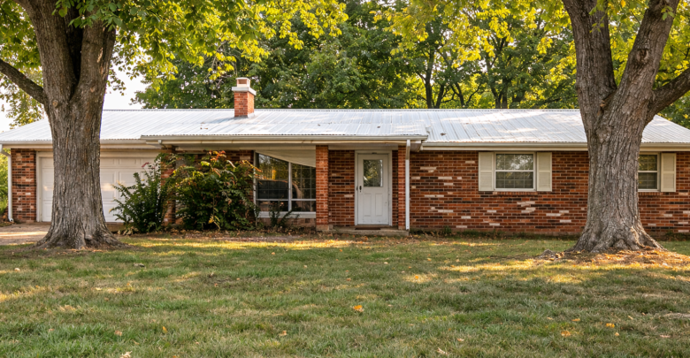 The house is located on a corner lot surrounded by trees, creating a sense of privacy and a natural view around the property. The surrounding environment is open and suitable for those who prefer peace and space outside.