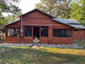 A charming screened-in back porch offers the perfect space to enjoy the surrounding landscape. Complete with a traditional double sink, the porch reflects the cabin’s historic style while providing a peaceful area for relaxation.