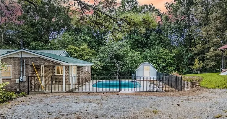 Outdoors, you’ll find a fully fenced pool area for safety and privacy, surrounded by open green space ideal for gardening, gatherings, or simply soaking up the Tennessee sunshine. A small, charming cabin-style outbuilding adds extra character and storage options.