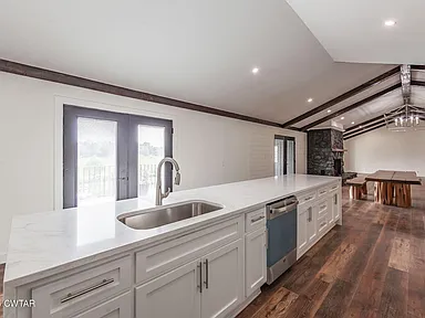 Interior finishes include durable laminate and porcelain flooring, tall ceilings, and a functional kitchen equipped with a center island and adjoining dining area, designed for everyday use and gatherings.