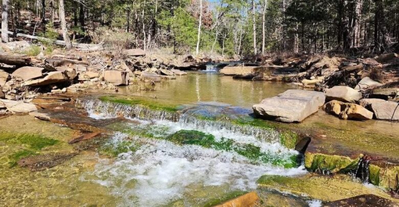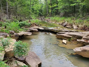 Set within the beautiful Kiamichi Mountains, the land features a mix of mostly level areas and gentle slopes that lead down to Little Kimbrough Creek. The creek borders the property, creating a peaceful atmosphere filled with the calming sound of flowing water.