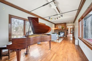 The interior design leans into the home’s unique character. Warm hardwood floors, exposed wooden beams, and a brick fireplace create a cozy cabin feel — but the views make it feel like something out of a fairytale. A grand piano sits prominently in the living room, giving the space an unexpected touch of elegance.